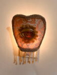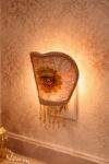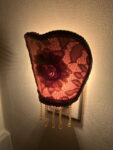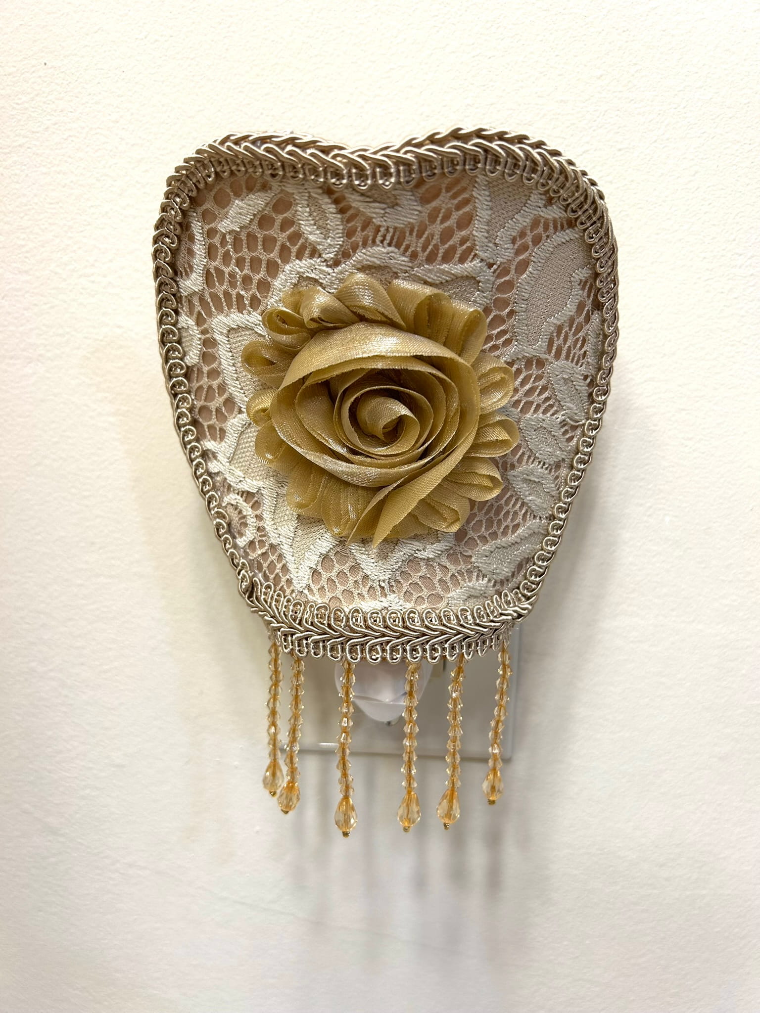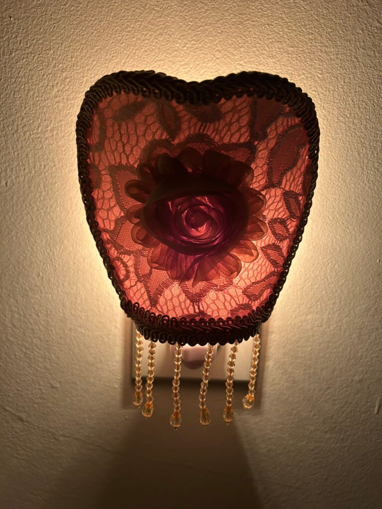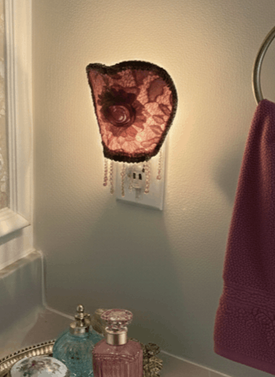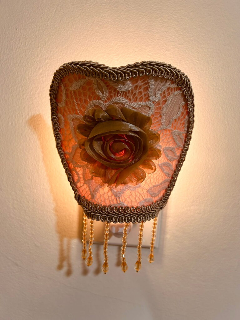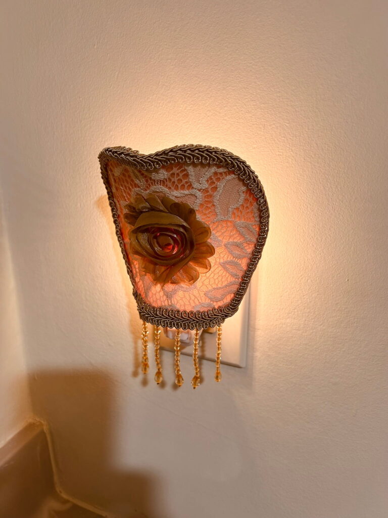 – Handcrafted nightlight with internal wire structure, covered in fabric, lace, fringe, and finishing trims