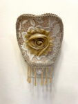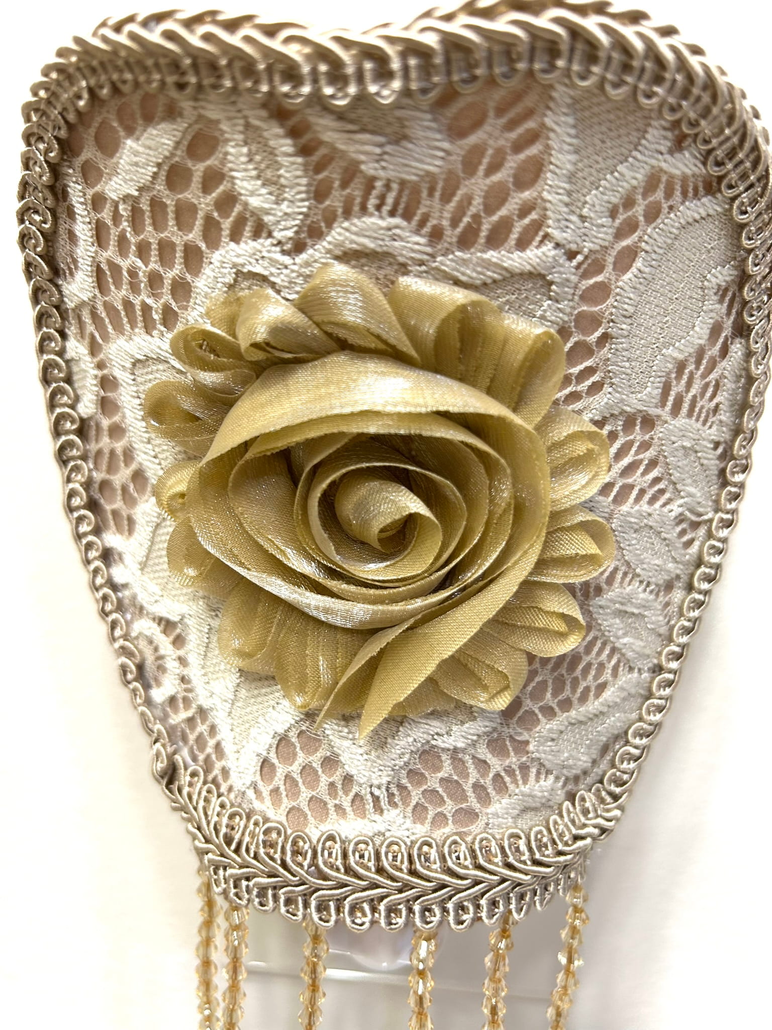 The shade is made with delicate lace fabric and features a carefully applied fabric flower on the front, adding depth, texture, and a romantic Victorian touch. It is finished with an embedded beaded fringe that softly reflects the light and enhances its warm, elegant glow.