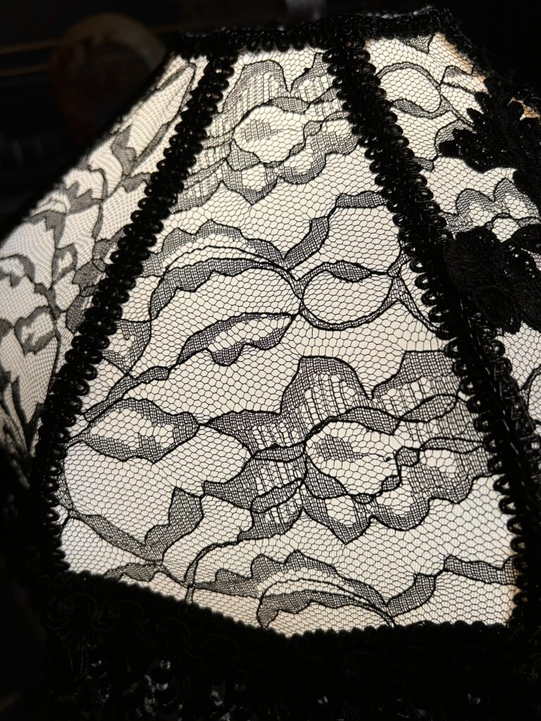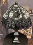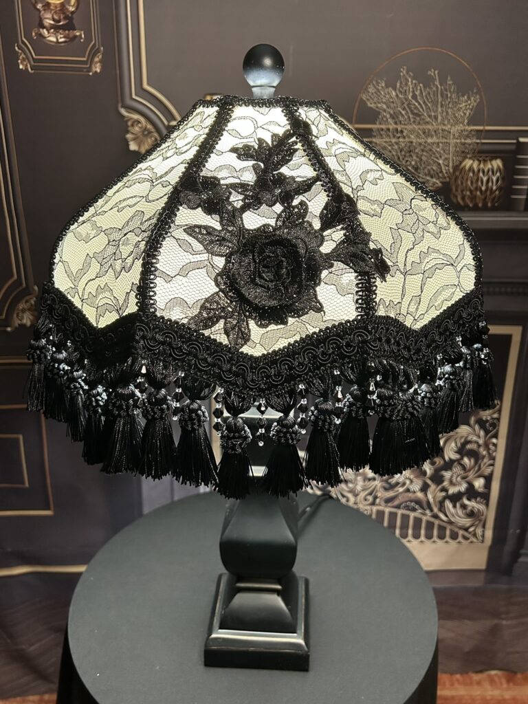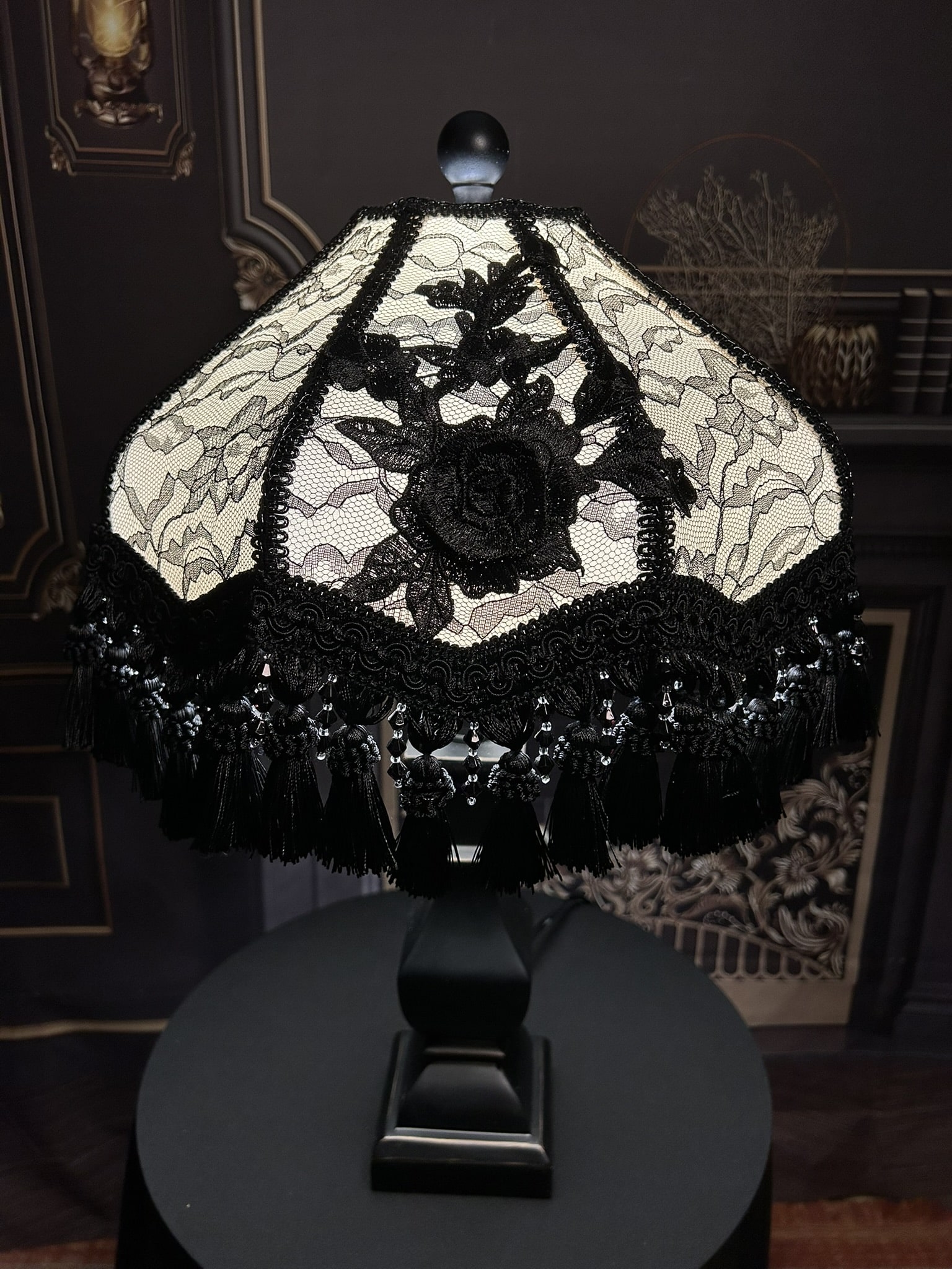Transform your space with the mysterious beauty of the Black Rose lampshade — a handcrafted creation that captures the drama and allure of Victorian design. Wrapped in layers of delicate black lace, it features an exquisite appliqué of embroidered roses at the center, symbolizing timeless romance. Each curve and contour reflects meticulous craftsmanship, turning this piece into a bold expression of refined taste.