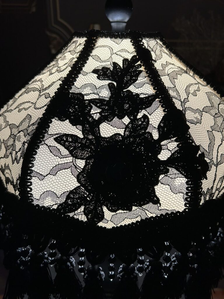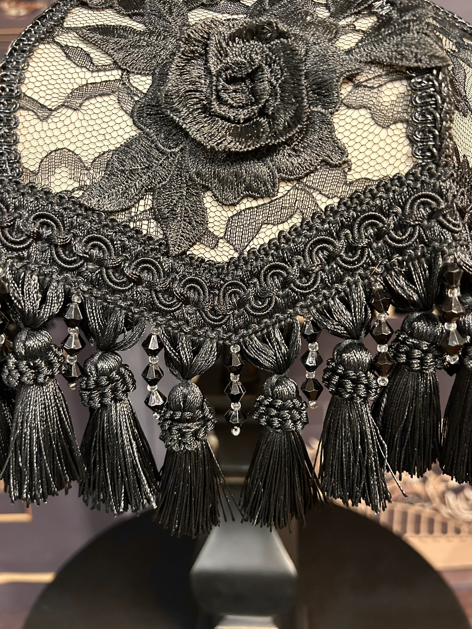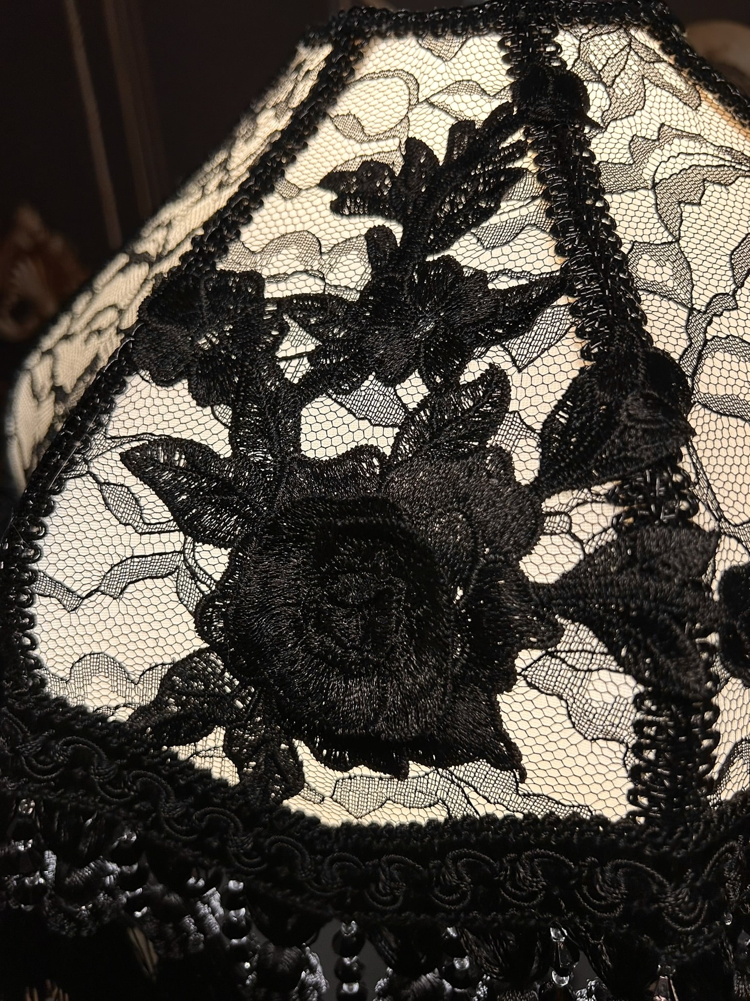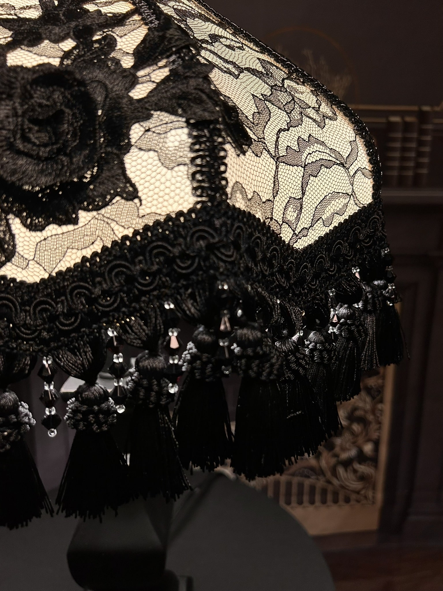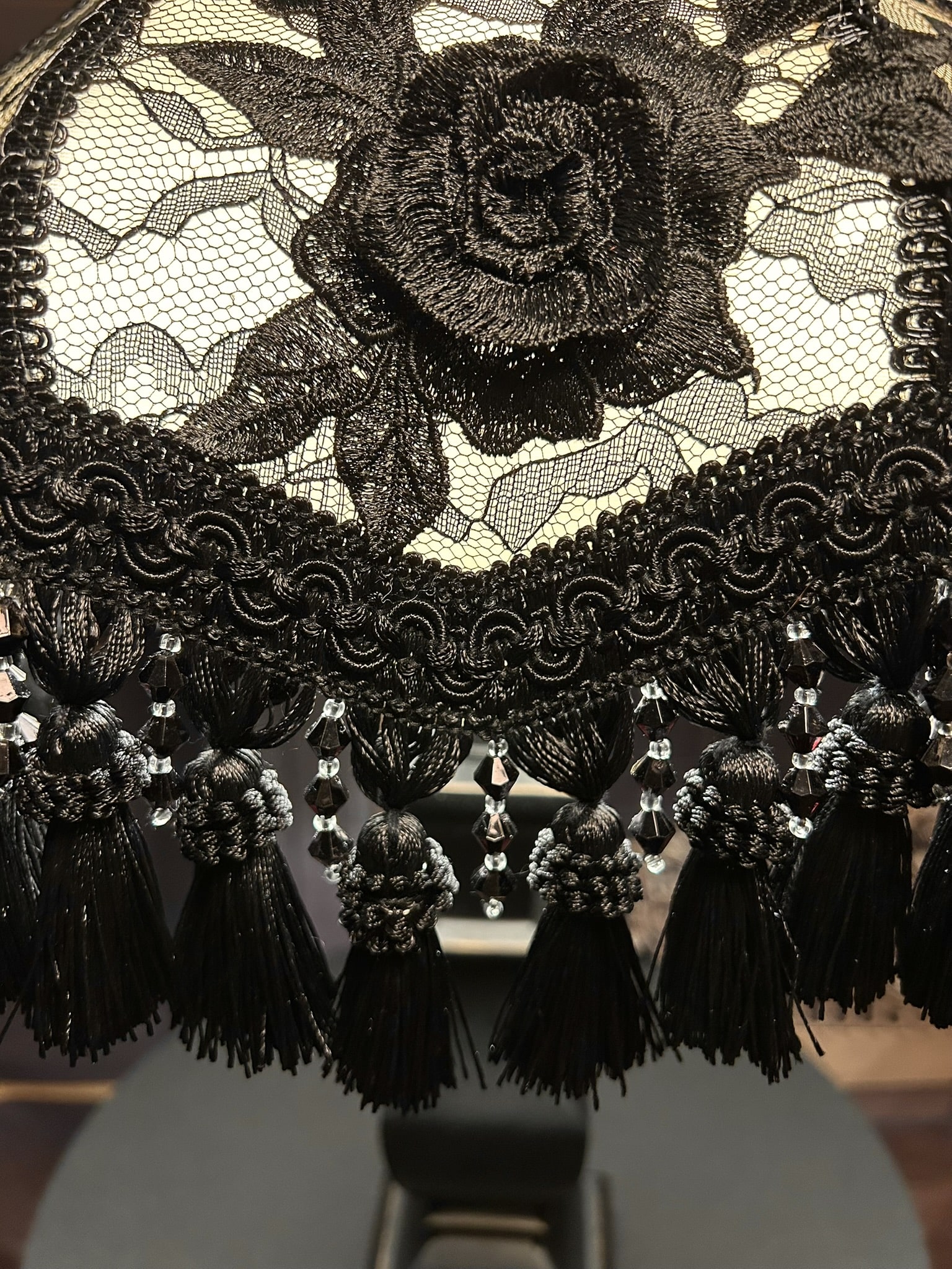 This lampshade rests on a sculptural black base with classic contours that enhance its refined silhouette. The combination of the matte black finish and the shimmering beaded fringe creates a captivating balance of texture and light. Every detail — from the lace embroidery to the hand-applied trimmings — reflects artistry and care, turning the Black Rose into a striking focal point that radiates sophistication and character.