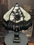 The Black Rosy Lampshade combines the richness of black-on-black textures with shimmering details that catch the light beautifully. Its intricate beaded and tasseled fringe blends silky threads with crystal-like accents, creating an enchanting play of light and shadow. Mounted on a sculptural black base, this lamp evokes the mood of candlelit parlors and Victorian mystery — a captivating centerpiece that adds depth, elegance, and a touch of theatrical grace to any room.