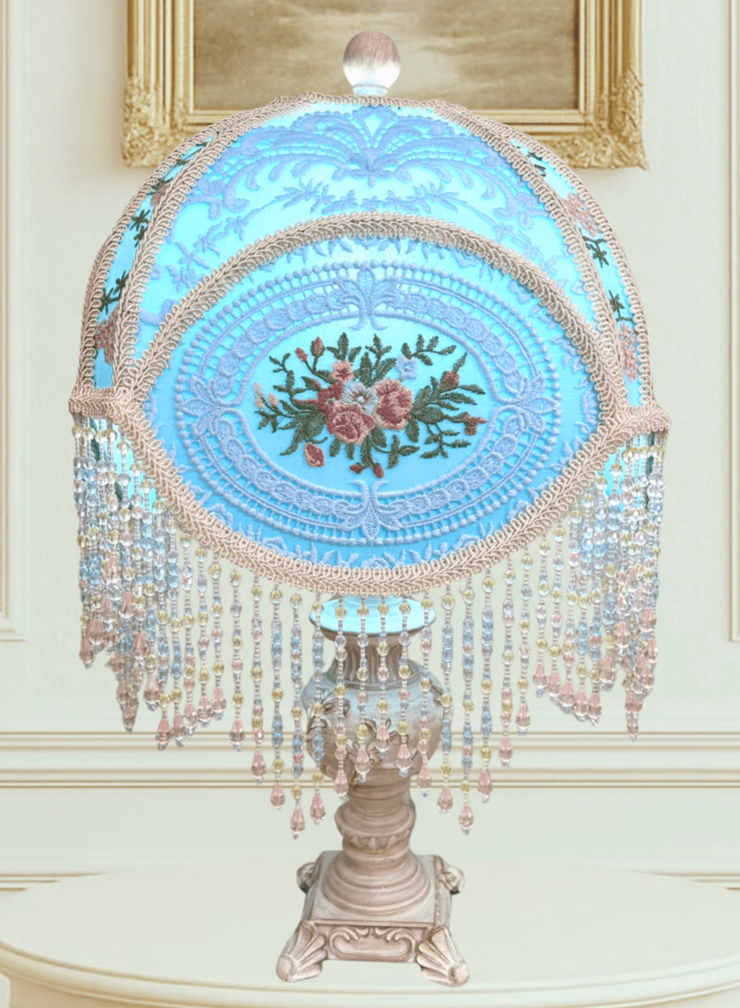 The Blue Floral Lampshade captures 19th-century elegance with its soft blue fabric adorned with delicate floral embroidery. The intricate lace details create a refined backdrop, while the pastel beaded fringe shimmers beautifully when illuminated, casting a serene and romantic glow. Paired with its vintage-inspired base in soft antique tones, this piece transforms any space into a graceful retreat filled with charm and sophistication.