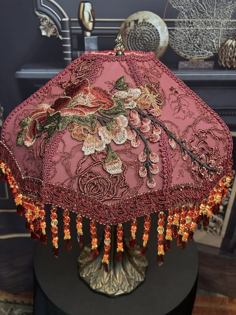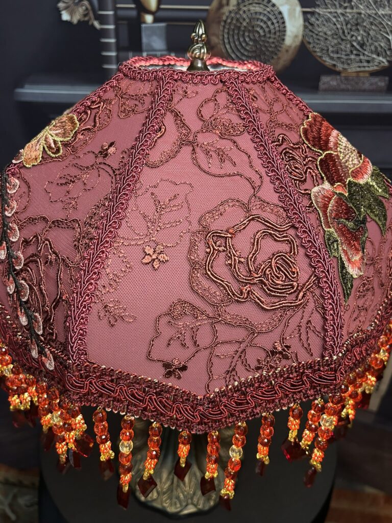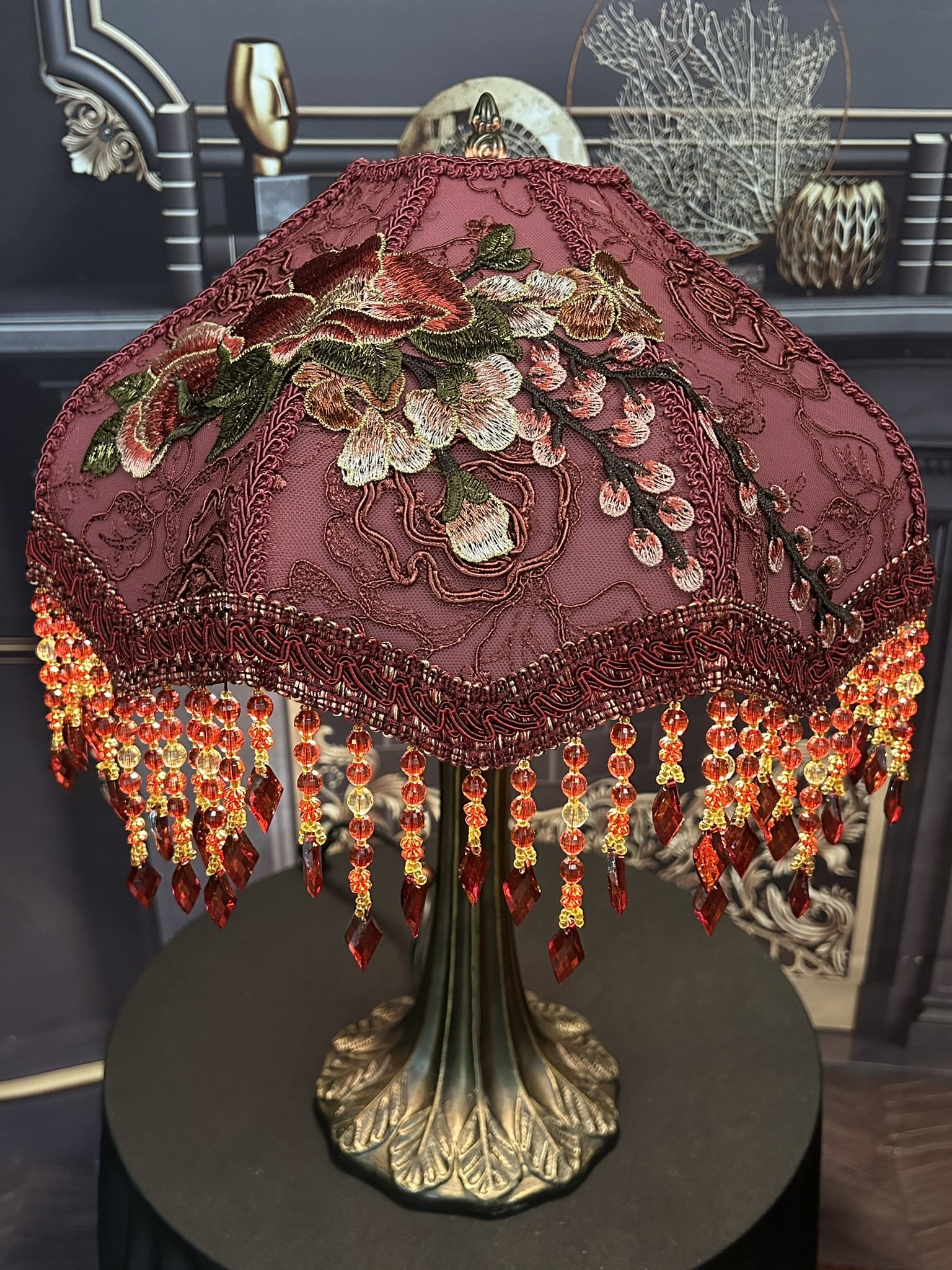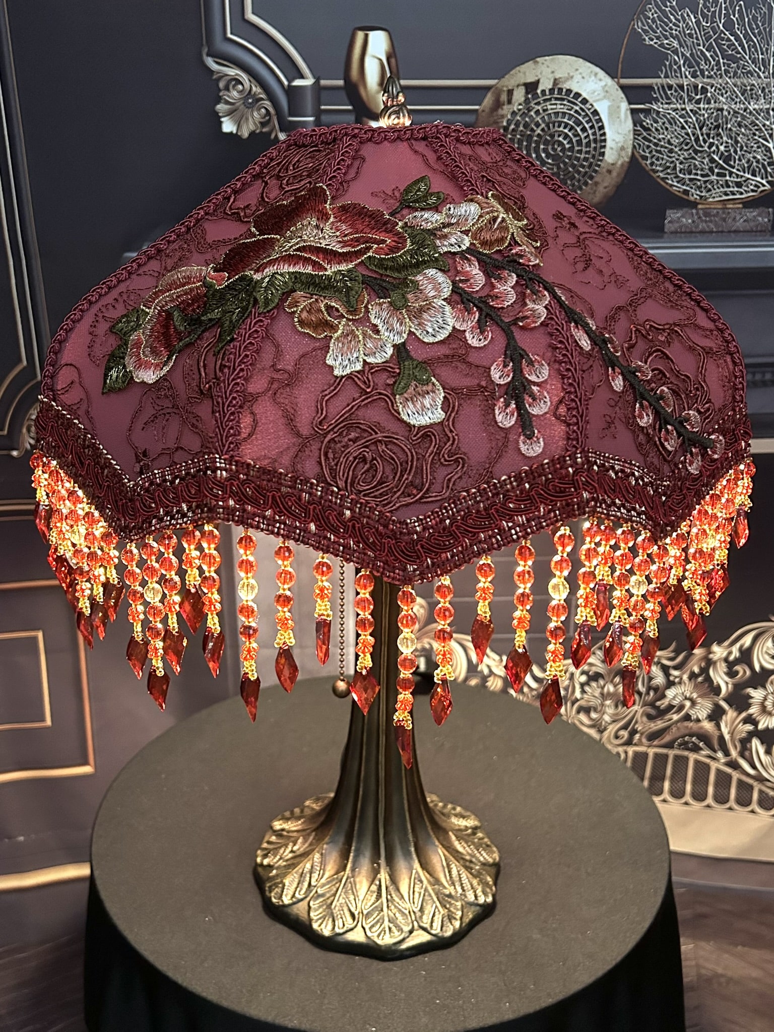 When illuminated, the Burgundy Flowers transforms into a radiant display of passion and refinement. The embroidered flowers glow with soft highlights, while the beaded fringe reflects warm tones that bring richness, texture, and an inviting ambiance. It’s more than a lamp — it’s a statement piece, perfect for enhancing a living room, bedroom, or any corner that deserves a touch of timeless elegance.