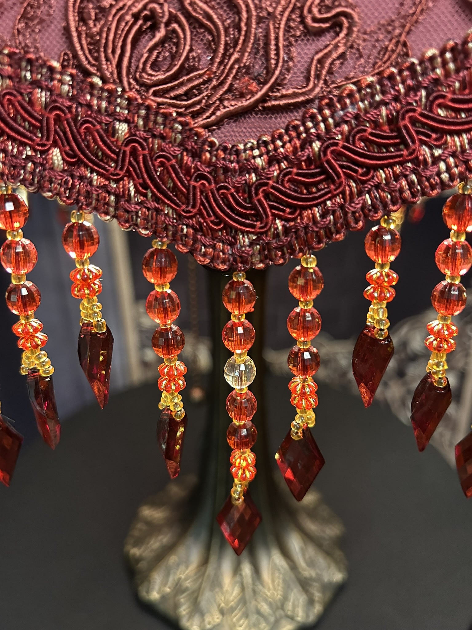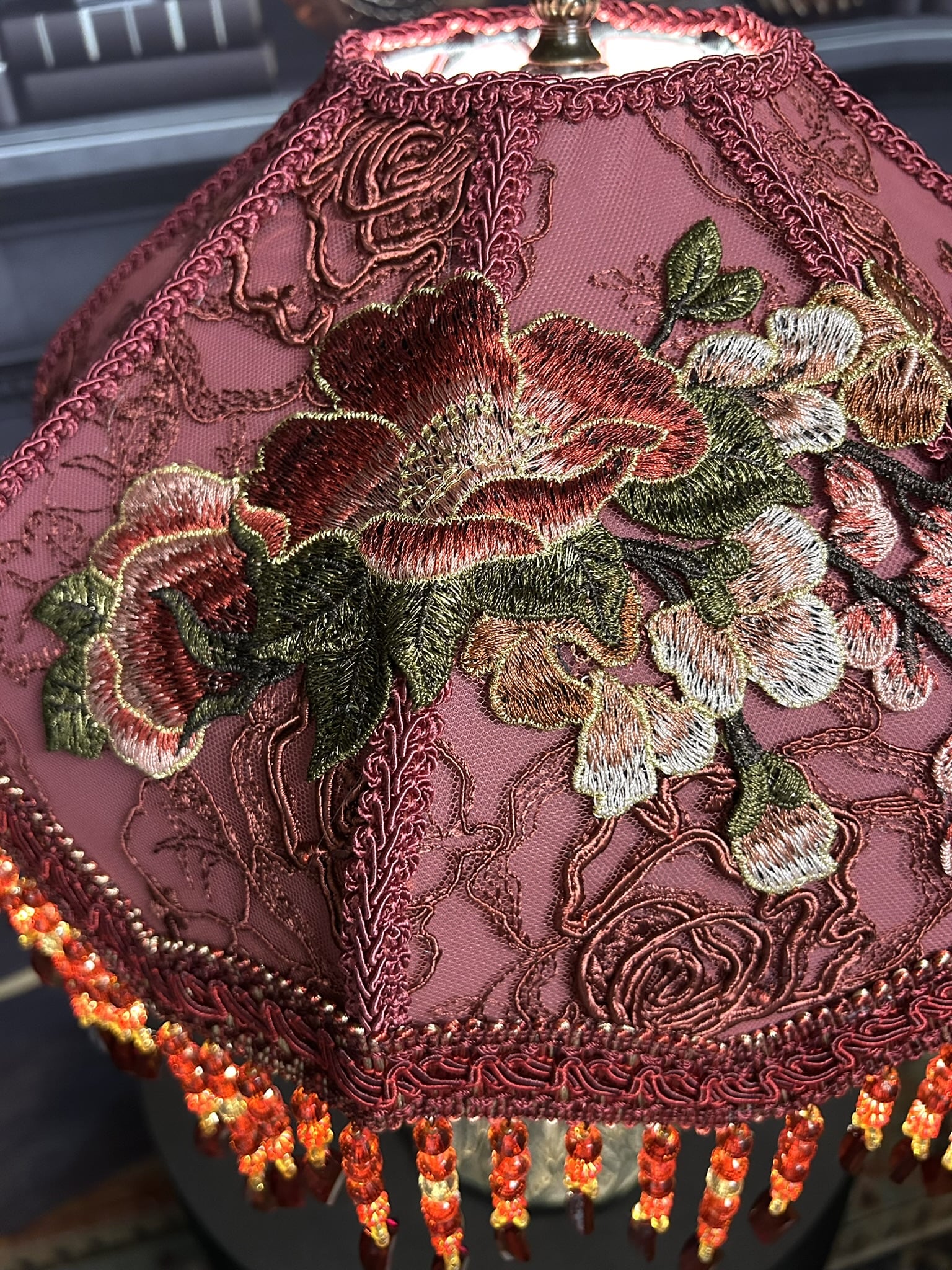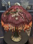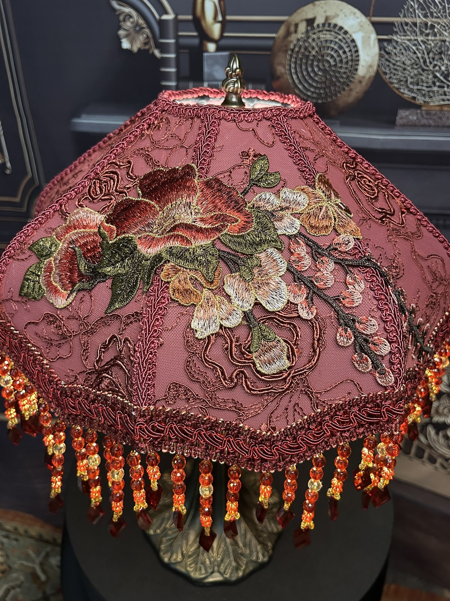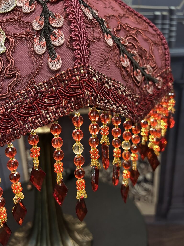 When illuminated, the Burgundy Flowers transforms into a radiant display of passion and refinement. The embroidered flowers glow with soft highlights, while the beaded fringe reflects warm tones that bring richness, texture, and an inviting ambiance. It’s more than a lamp — it’s a statement piece, perfect for enhancing a living room, bedroom, or any corner that deserves a touch of timeless elegance.