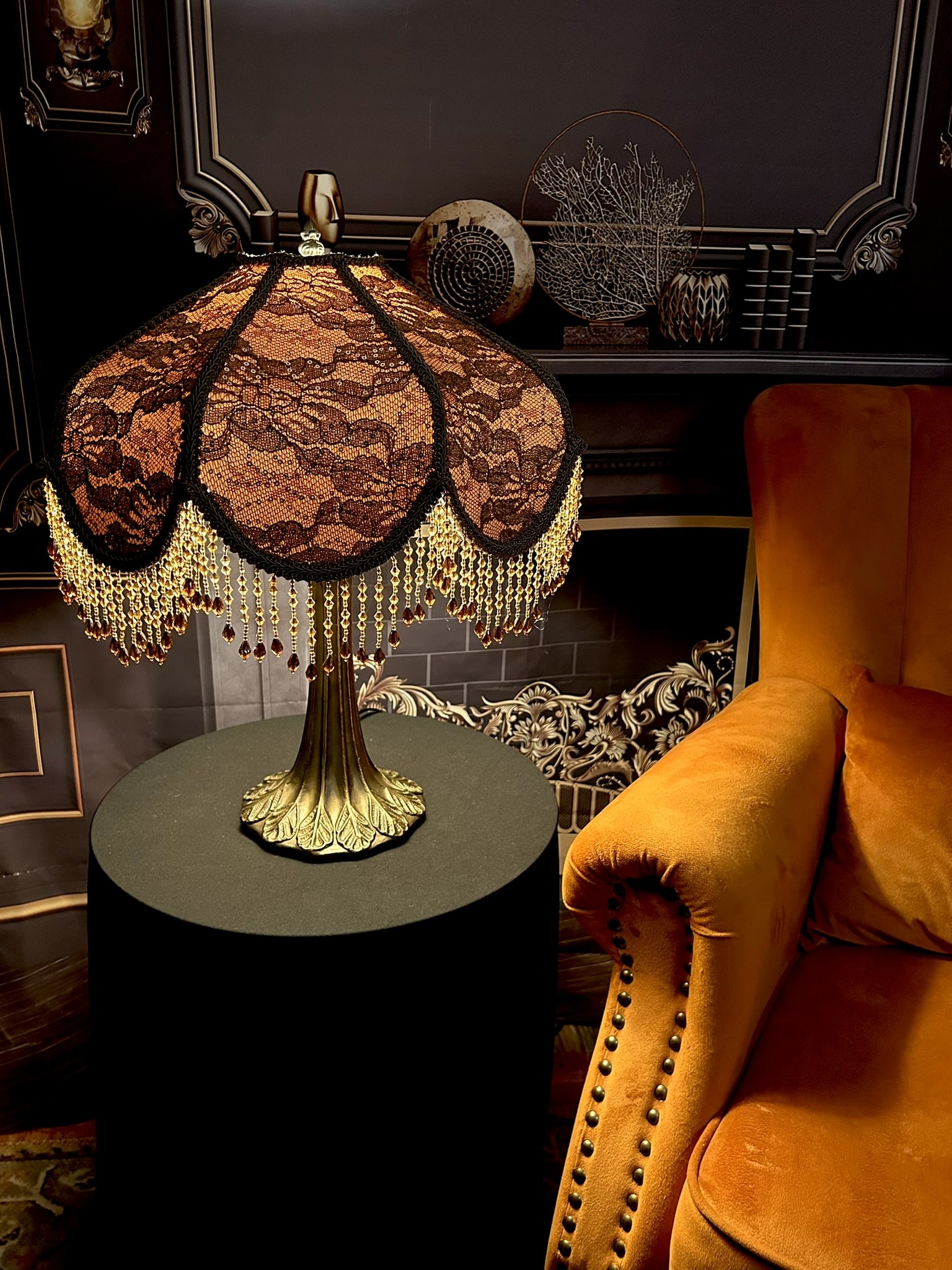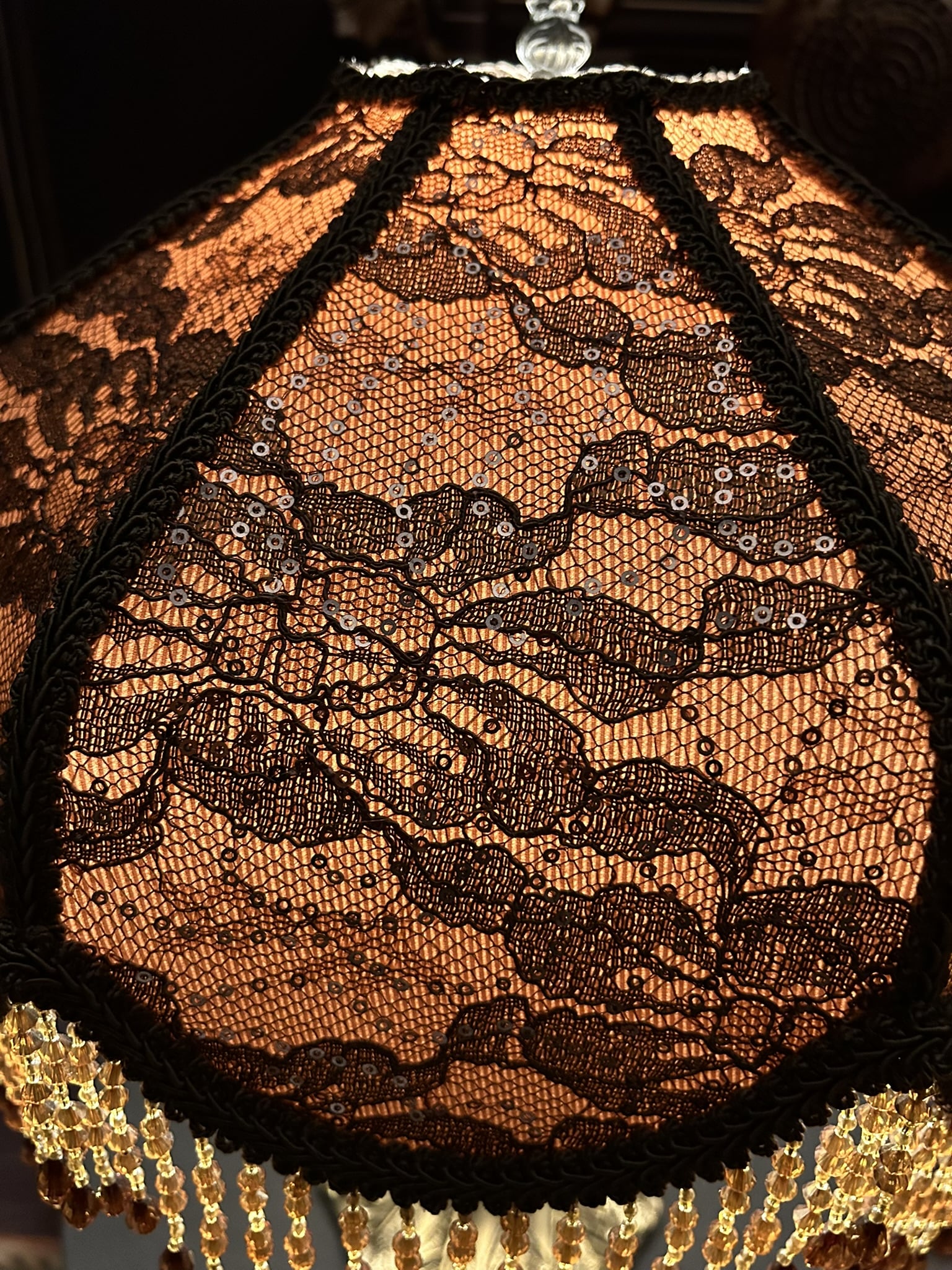 The Chocolate Lace Lampshade captures the timeless glamour of the 19th century with its chocolate-toned fabric delicately covered in brown lace embellished with subtle sequins that shimmer softly when illuminated. A cascading fringe of amber and gold beads enhances the design, reflecting light with graceful movement and creating a soothing golden glow.