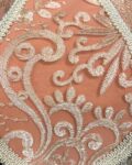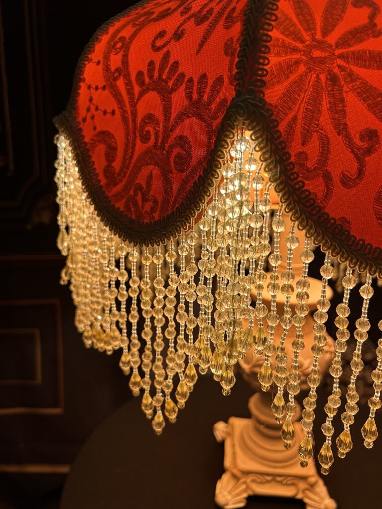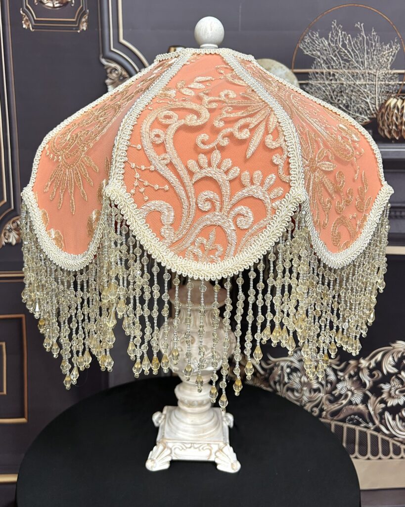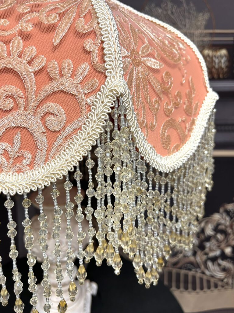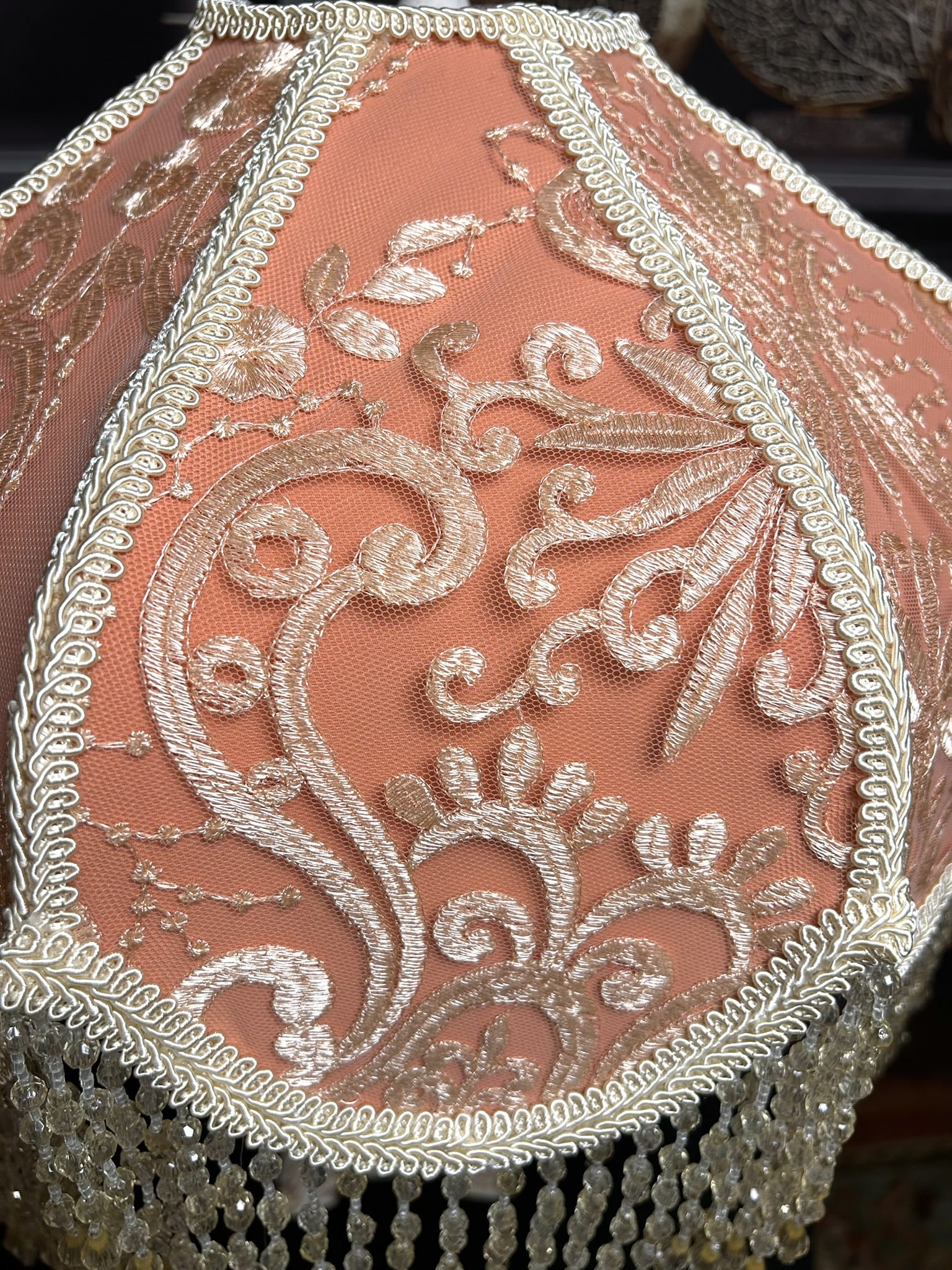 The Coral Sunset lampshade features delicate peach embroidery over deeper coral fabric, forming an elegant tone-on-tone effect that exudes subtle refinement. Finished with a crystal-style beaded fringe that sparkles gracefully when illuminated, it rests on a vintage-style base in soft ivory tones, enhancing its gentle glow. A true statement piece that merges 19th-century glamour with contemporary warmth — filling your space with beauty, harmony, and charm.