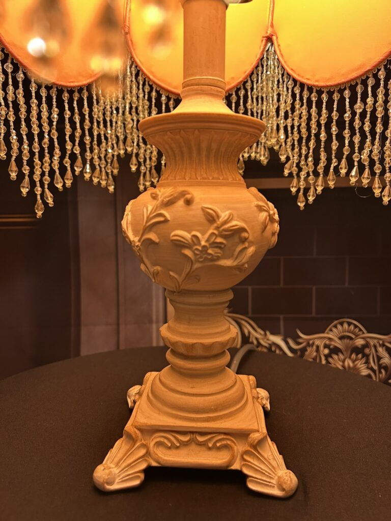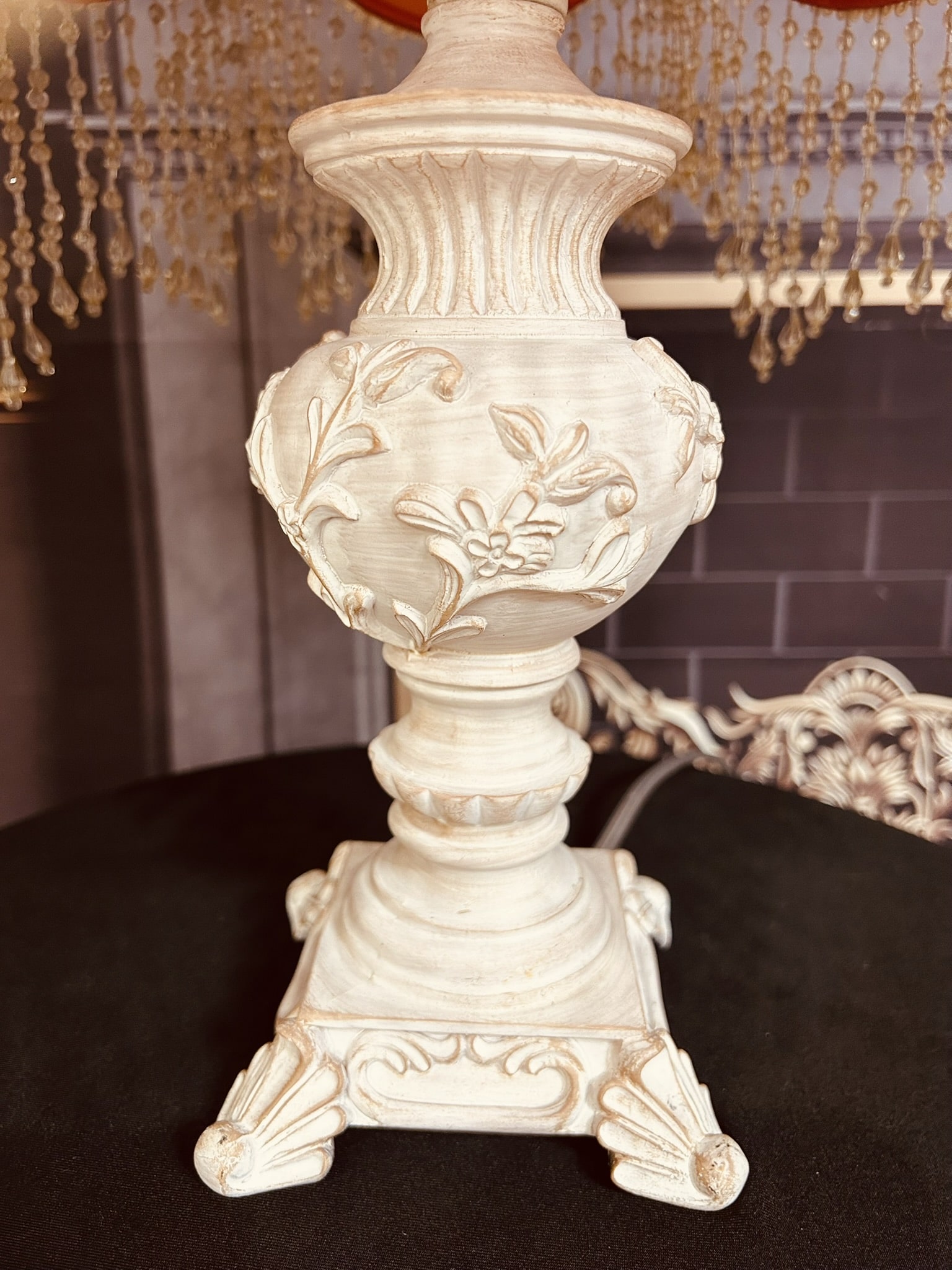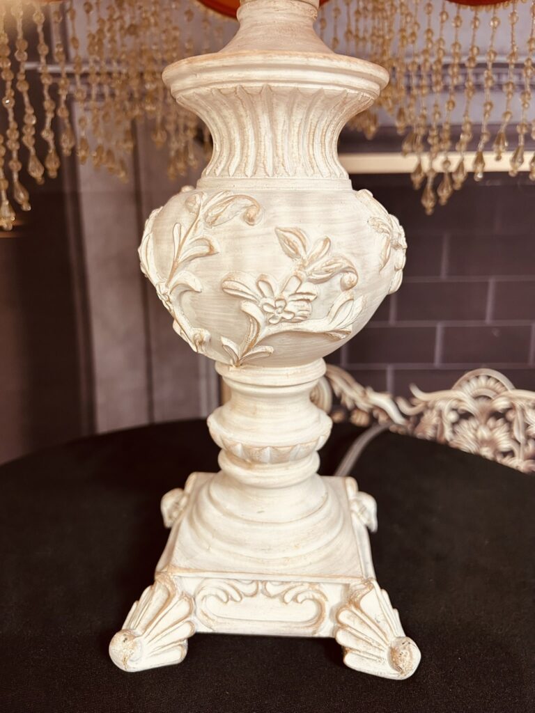 This lampshade comes with an ornate vintage-style base in a muted ivory finish. Sculpted with floral reliefs and classic curves, the base perfectly complements the delicate tones of the shade, ensuring balance and adding a refined nostalgic charm to any setting.