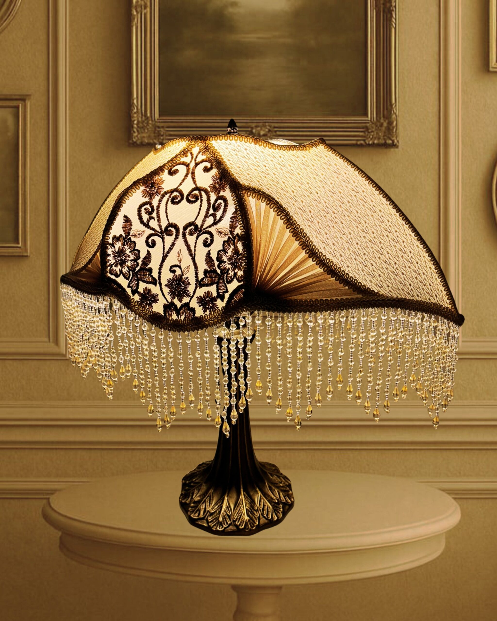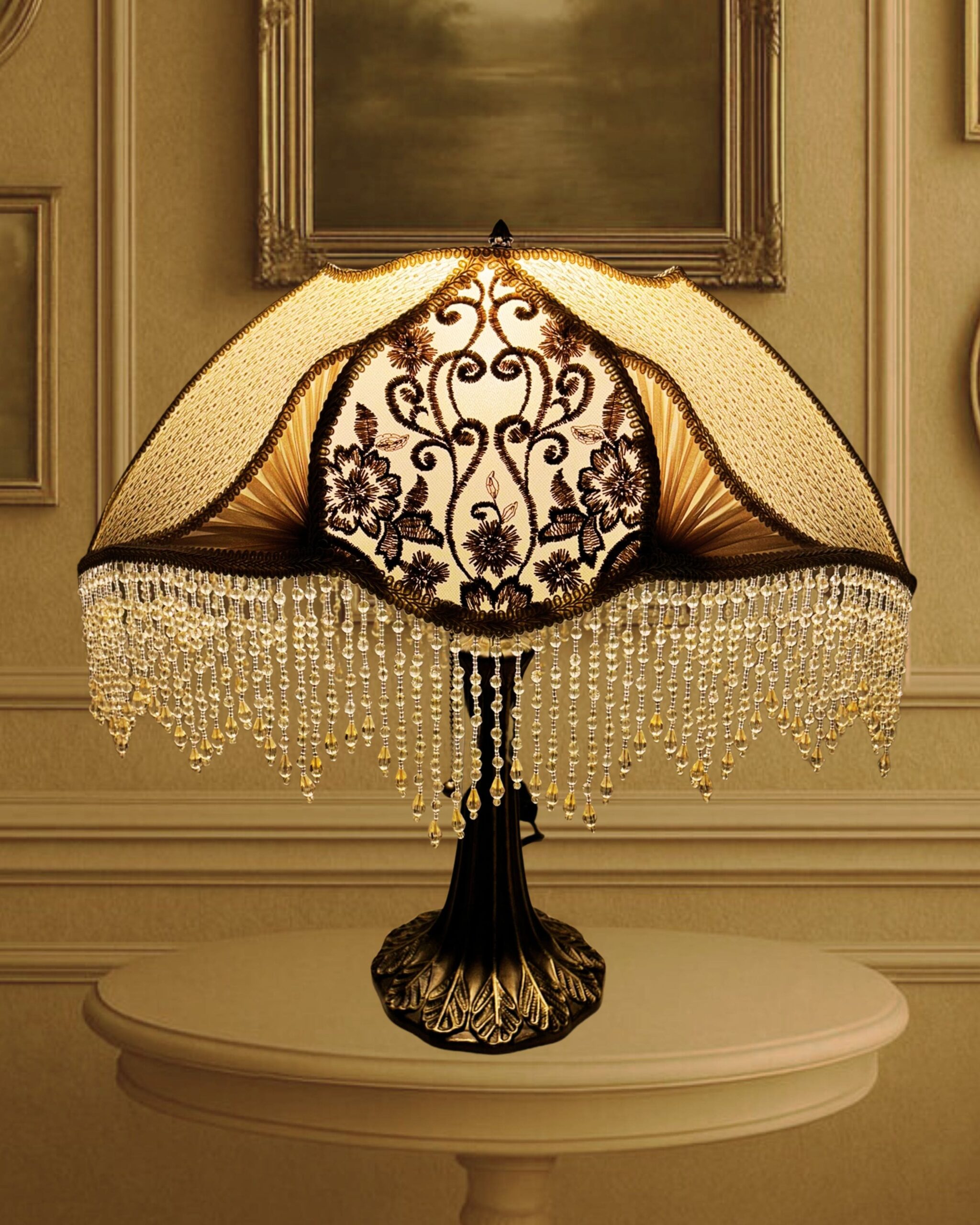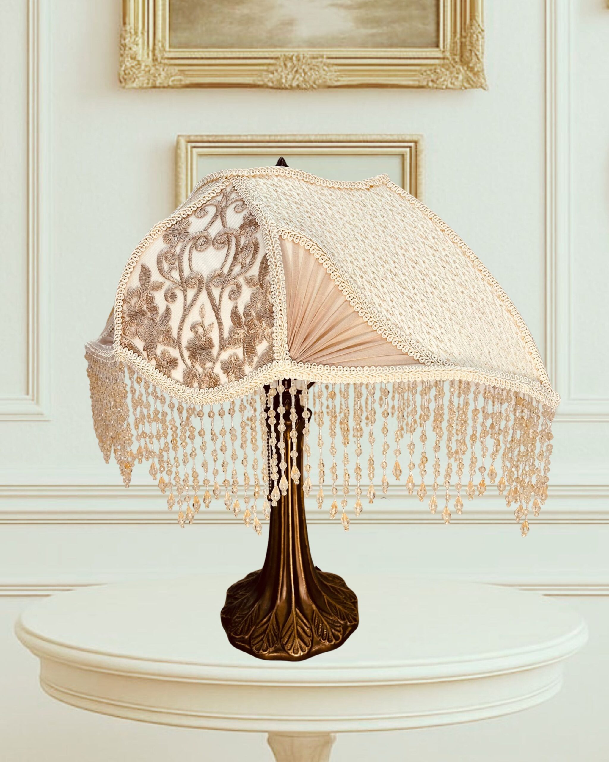 The Ivory Ballerina Lampshade captures 19th-century sophistication with its ivory-toned fabric, adorned with intricate floral embroidery and soft pleated silk chiffon panels. The shimmering beaded fringe cascades elegantly, reflecting light with a romantic glow. Paired with its vintage-inspired base in antique tones, this piece transforms any room into a serene retreat filled with charm and sophistication.