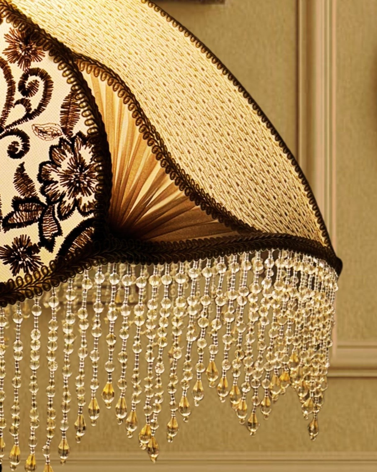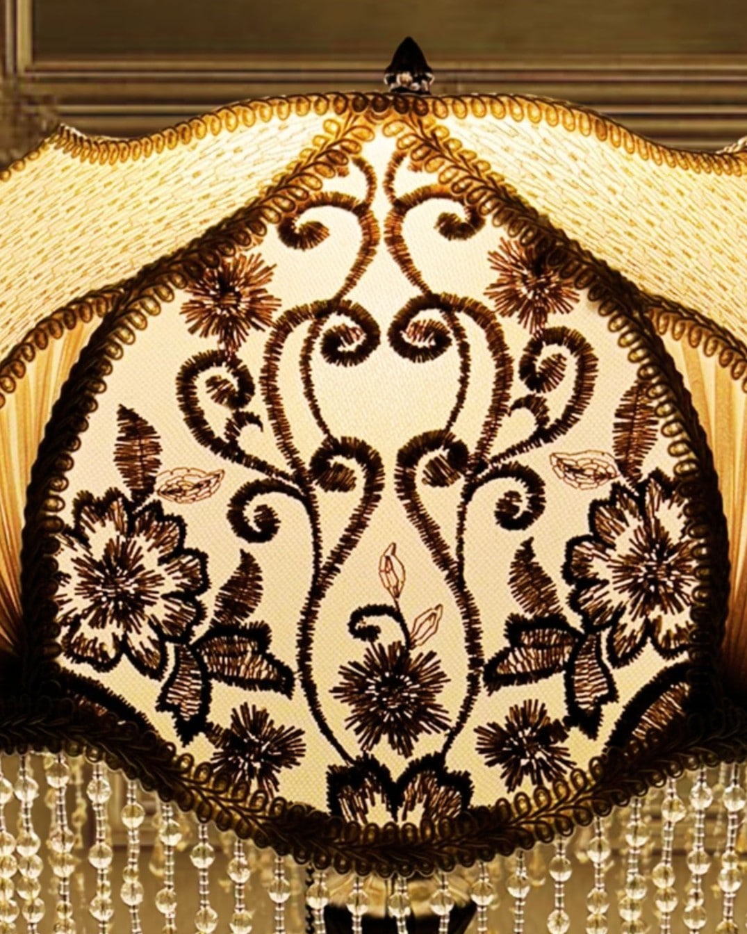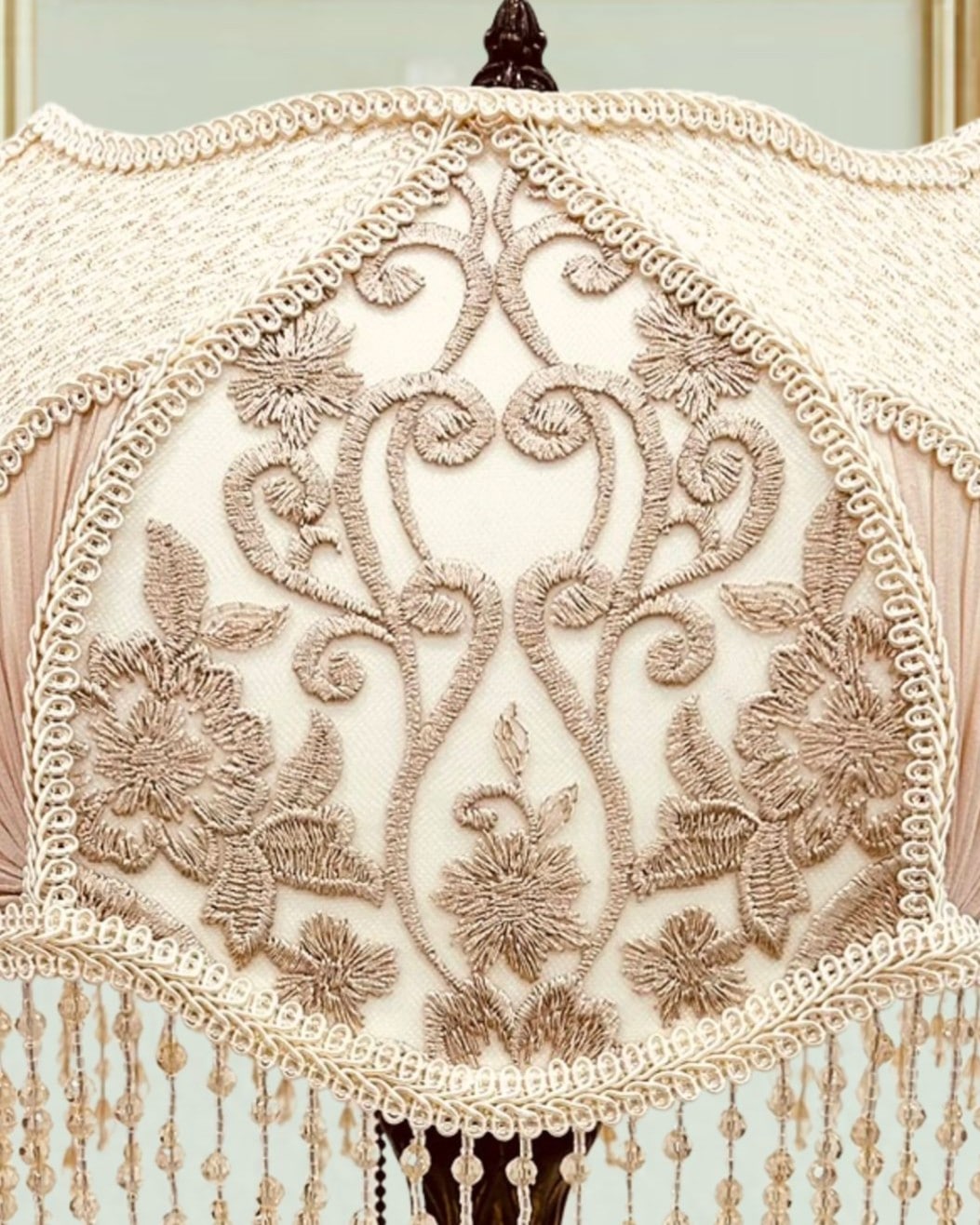 The Ivory Ballerina Lampshade captures 19th-century sophistication with its ivory-toned fabric, adorned with intricate floral embroidery and soft pleated silk chiffon panels. The shimmering beaded fringe cascades elegantly, reflecting light with a romantic glow. Paired with its vintage-inspired base in antique tones, this piece transforms any room into a serene retreat filled with charm and sophistication.