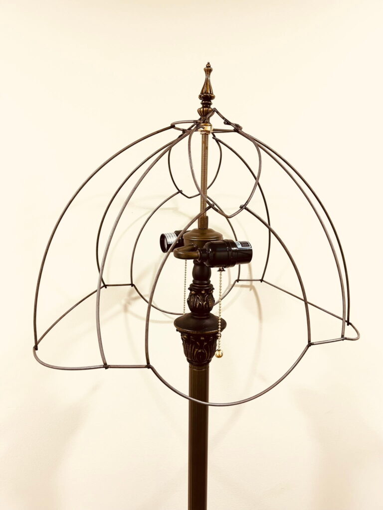 This Gothic leaf wire frame model features a spider fitter, compatible with standard lamp bases designed for this type of attachment.
