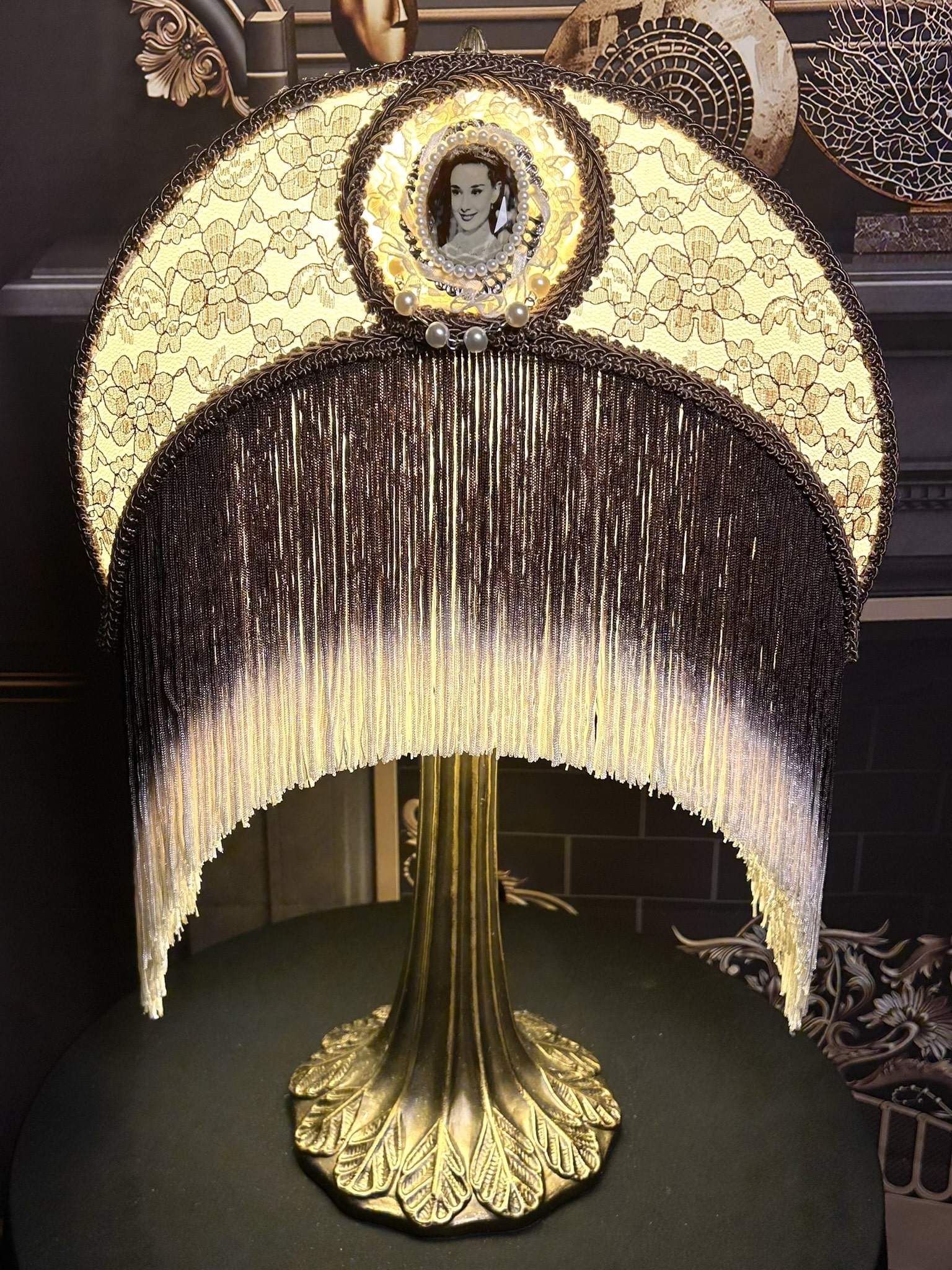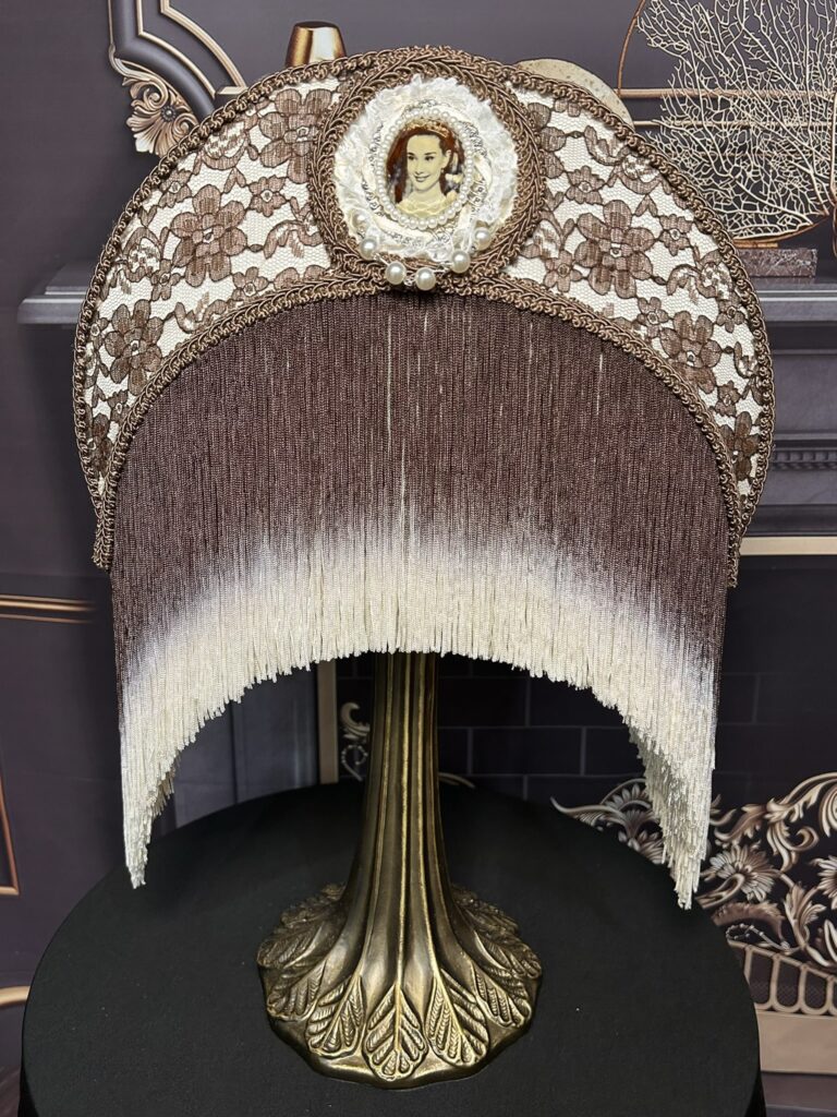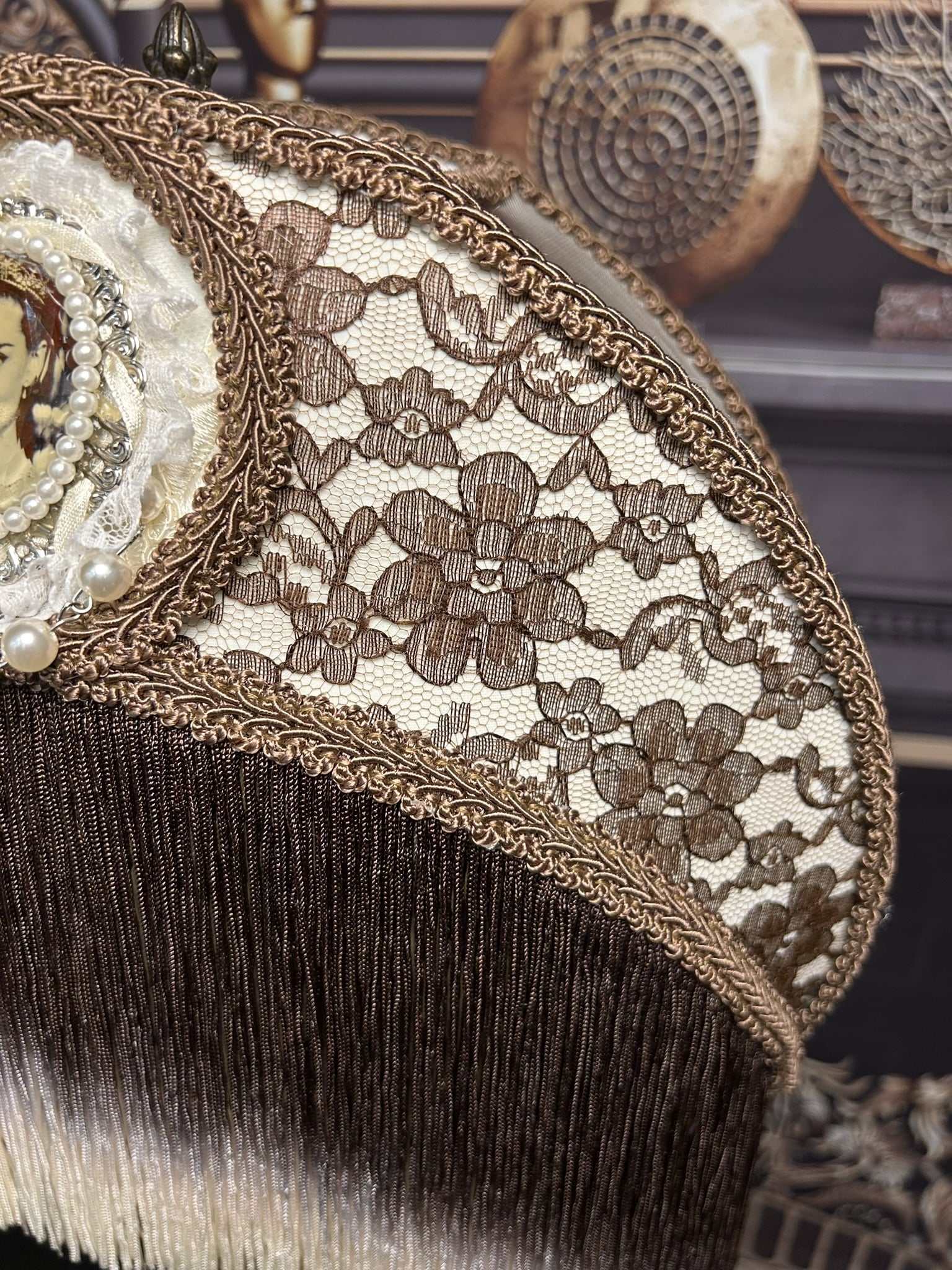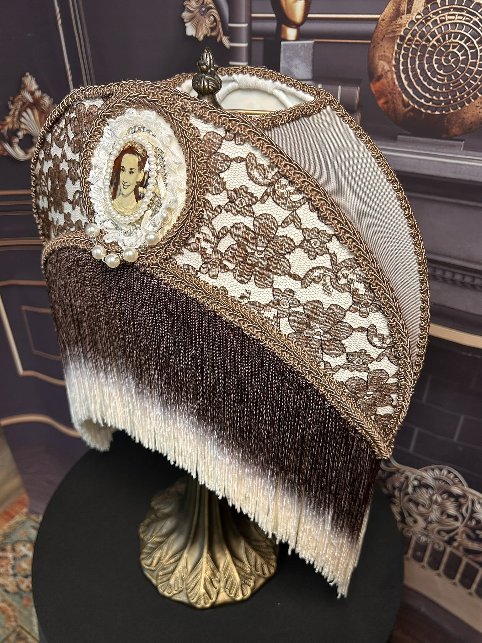 Vintage Moon Lampshade captures 19th-century refinement with a romantic Hollywood touch. At its center, a vintage-style cameo brooch framed with pearls and lace celebrates timeless femininity and classic allure. The flowing ombré fringe in rayon threads fades beautifully from brown to ivory, reflecting light with an elegant shimmer. Paired with its antique-tone base, this piece transforms any room into a serene retreat filled with warmth, nostalgia, and charm.