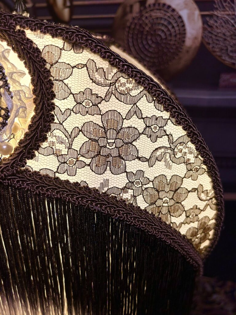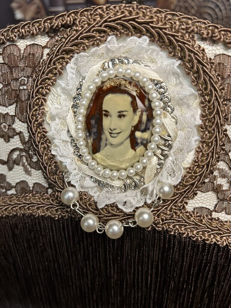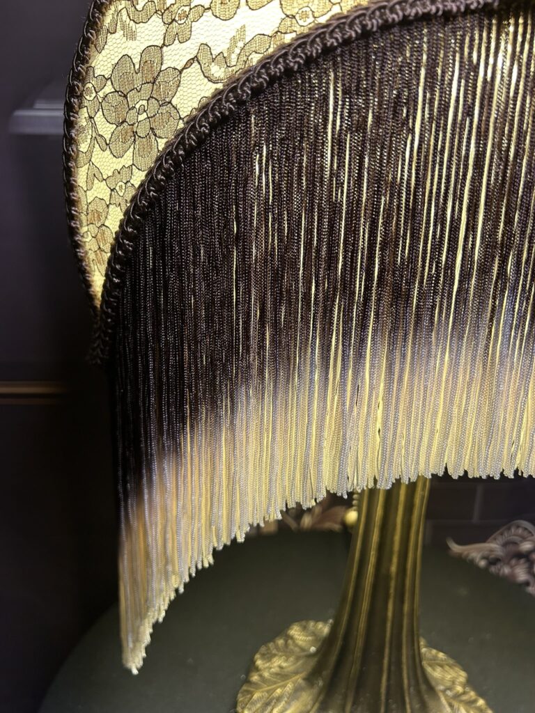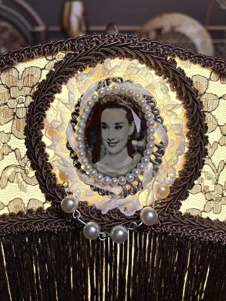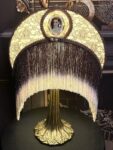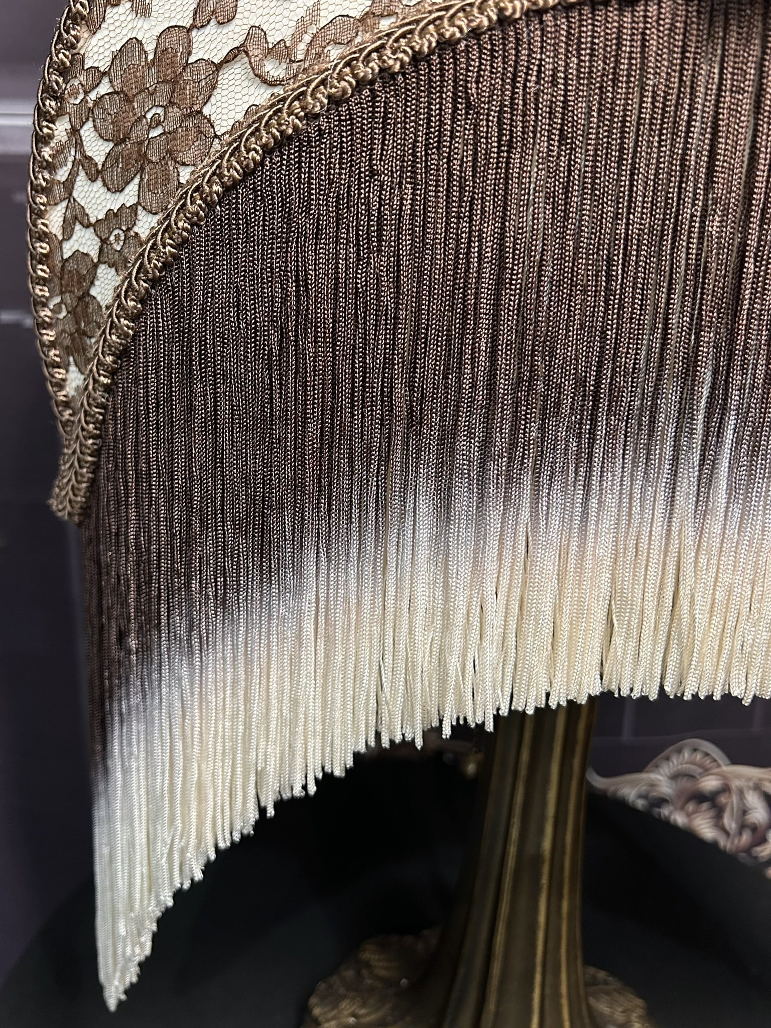 Vintage Moon Lampshade captures 19th-century refinement with a romantic Hollywood touch. At its center, a vintage-style cameo brooch framed with pearls and lace celebrates timeless femininity and classic allure. The flowing ombré fringe in rayon threads fades beautifully from brown to ivory, reflecting light with an elegant shimmer. Paired with its antique-tone base, this piece transforms any room into a serene retreat filled with warmth, nostalgia, and charm.