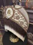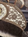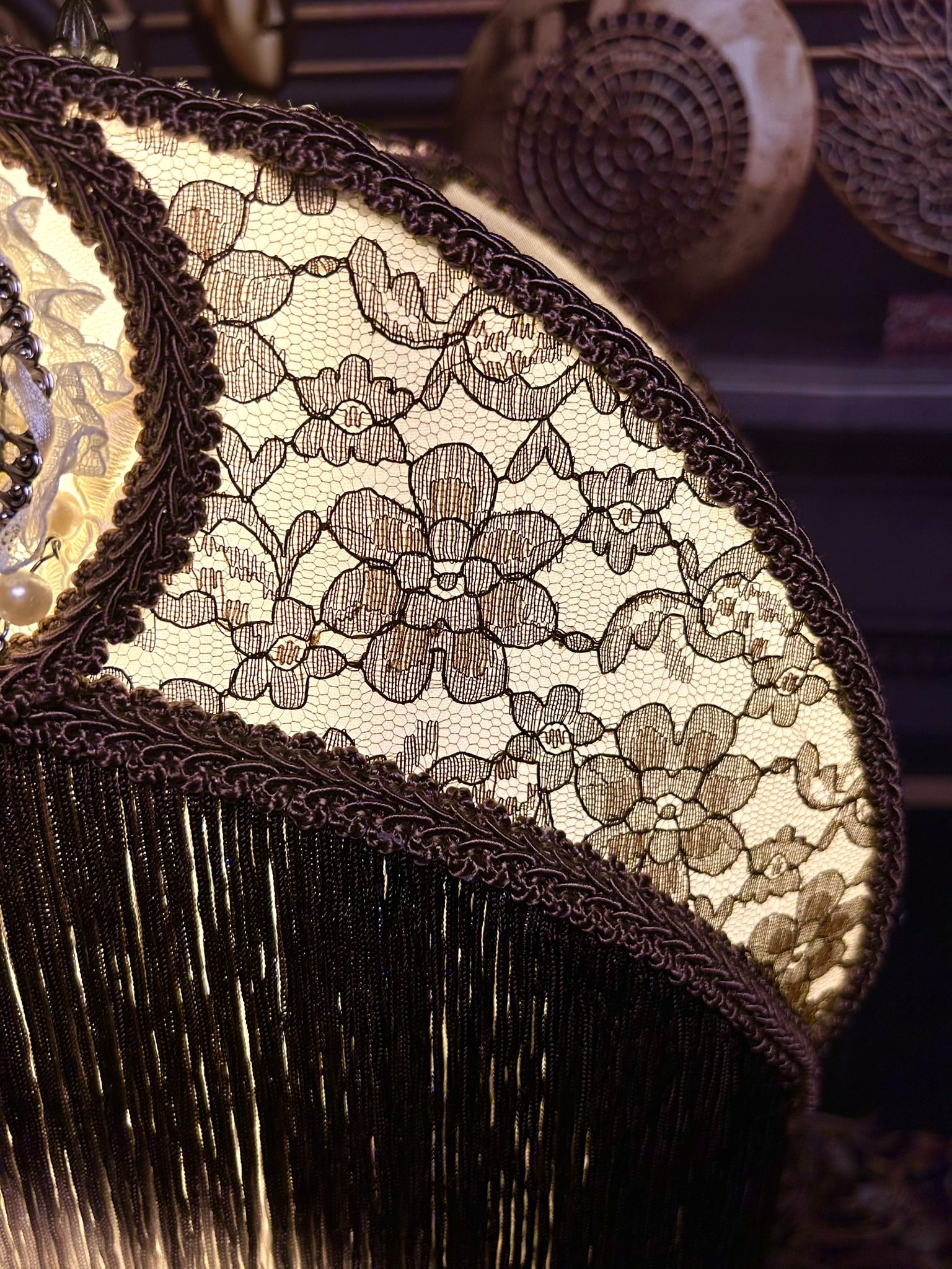 With its warm ivory and brown tones, intricate lace, and delicate tulle panels, the Vintage Moon Lampshade is ideal for interiors that embrace elegance, romance, and timeless beauty. Whether placed in a vintage-inspired bedroom, an antique-filled study, or a modern living room in need of a refined touch, this handcrafted half-moon lampshade becomes a luminous centerpiece that radiates charm and sophistication.