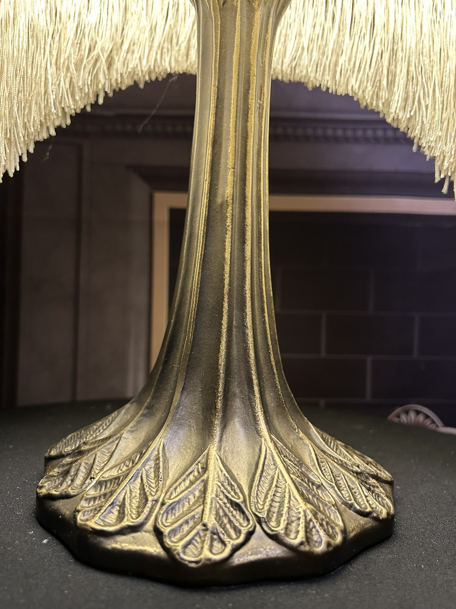 This lampshade comes with an elegant vintage-style base in an antique bronze finish. Sculpted with graceful leaf motifs, the base provides a balanced foundation that perfectly complements the soft hues and flowing ombré fringe of the shade. Its classic silhouette enhances the overall harmony of the design, adding a touch of nostalgic glamour and warmth to any setting.