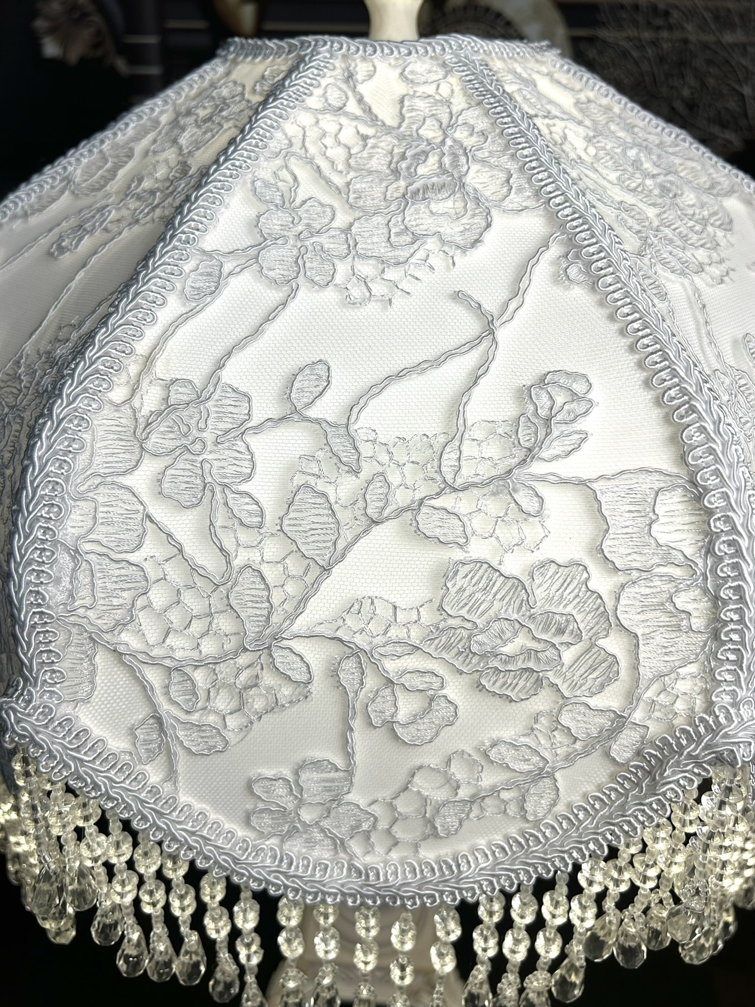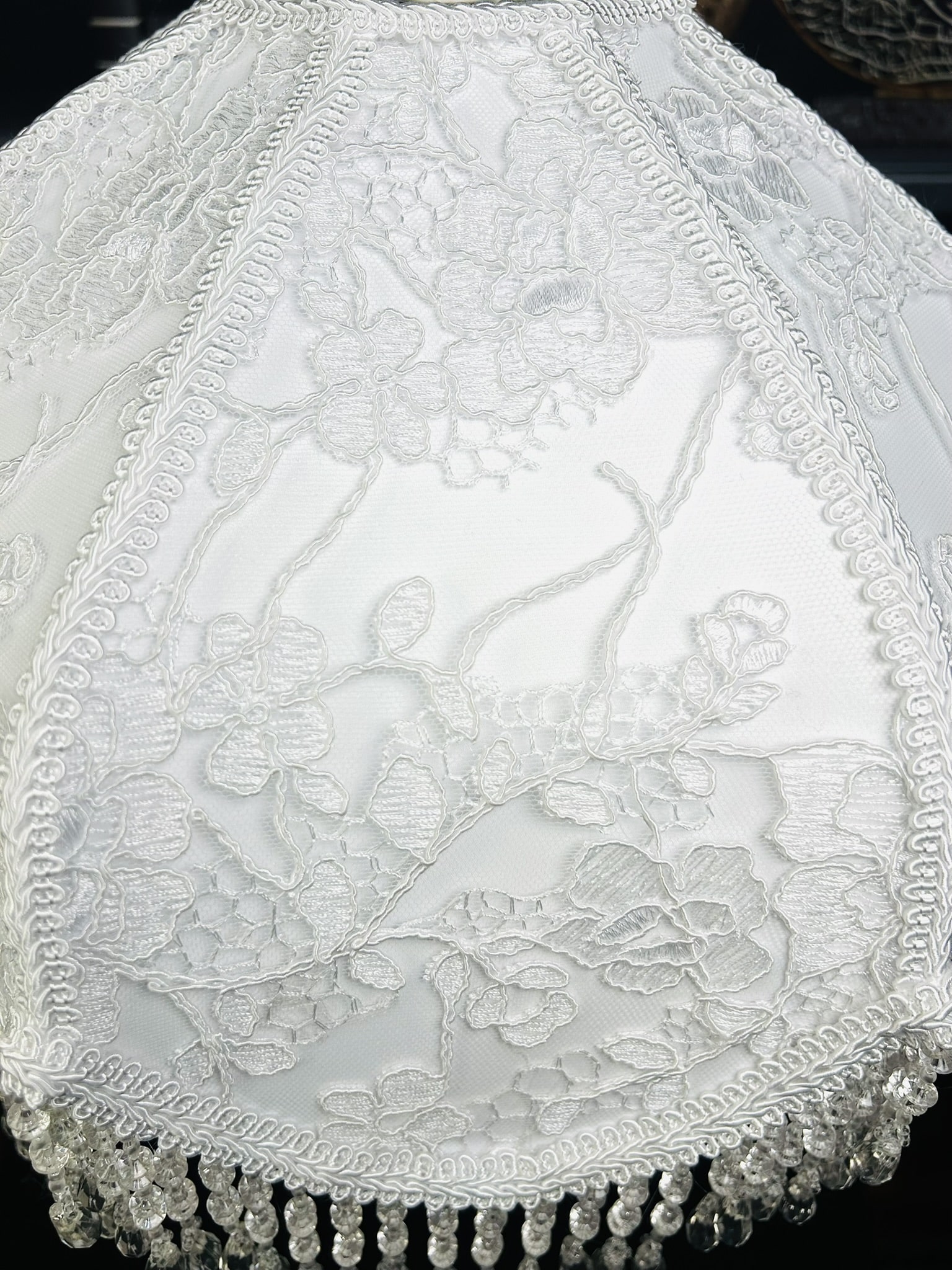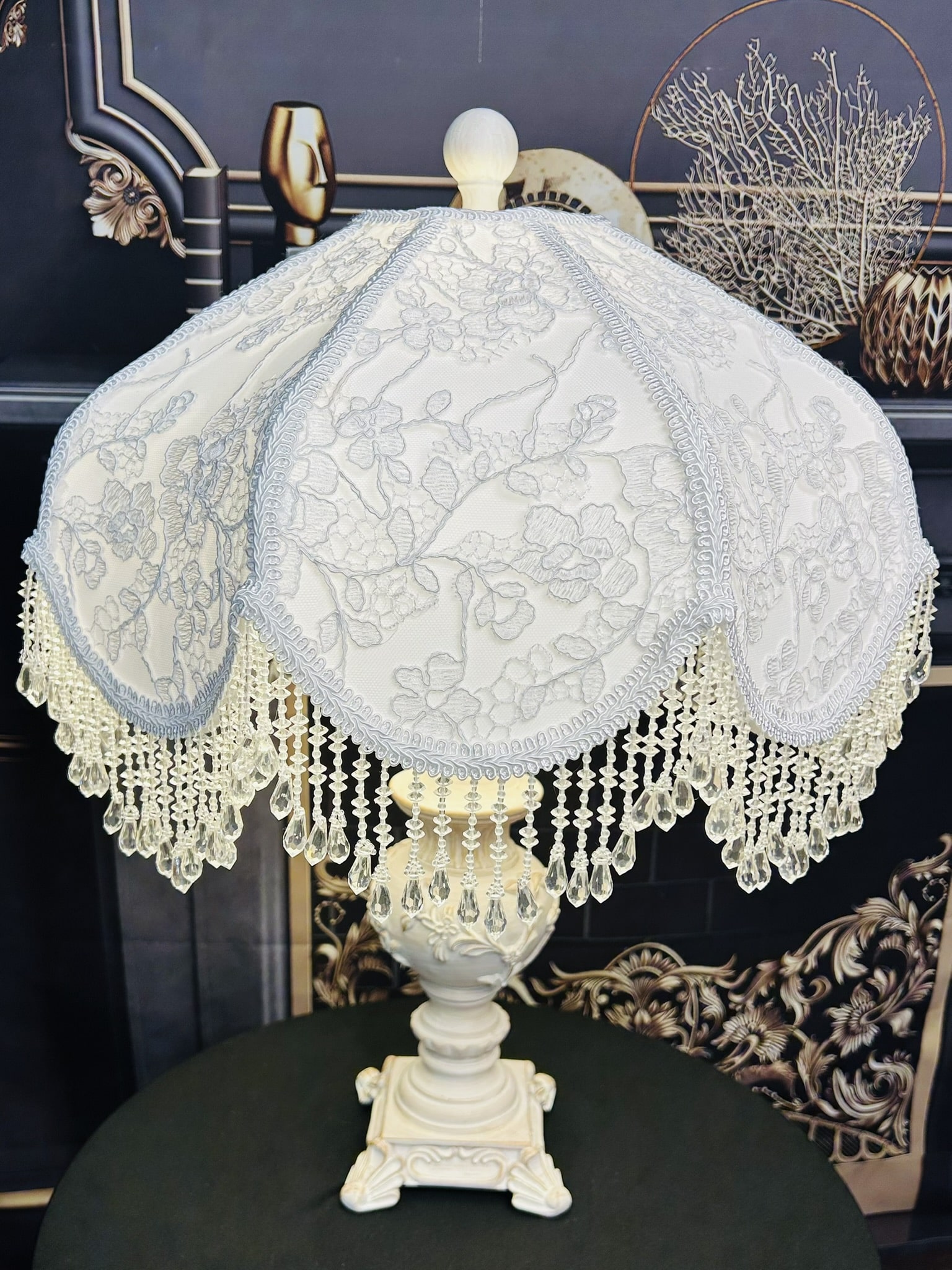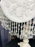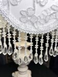 The White Floral lampshade captures 19th-century elegance with its pure white fabric overlaid with delicate floral lace embroidery. The intricate details create a refined backdrop, while the crystal-style beaded fringe sparkles gracefully when illuminated, casting a serene and timeless glow. Paired with its vintage-inspired base in soft wood tones, this piece transforms any space into an intimate retreat filled with charm and sophistication.