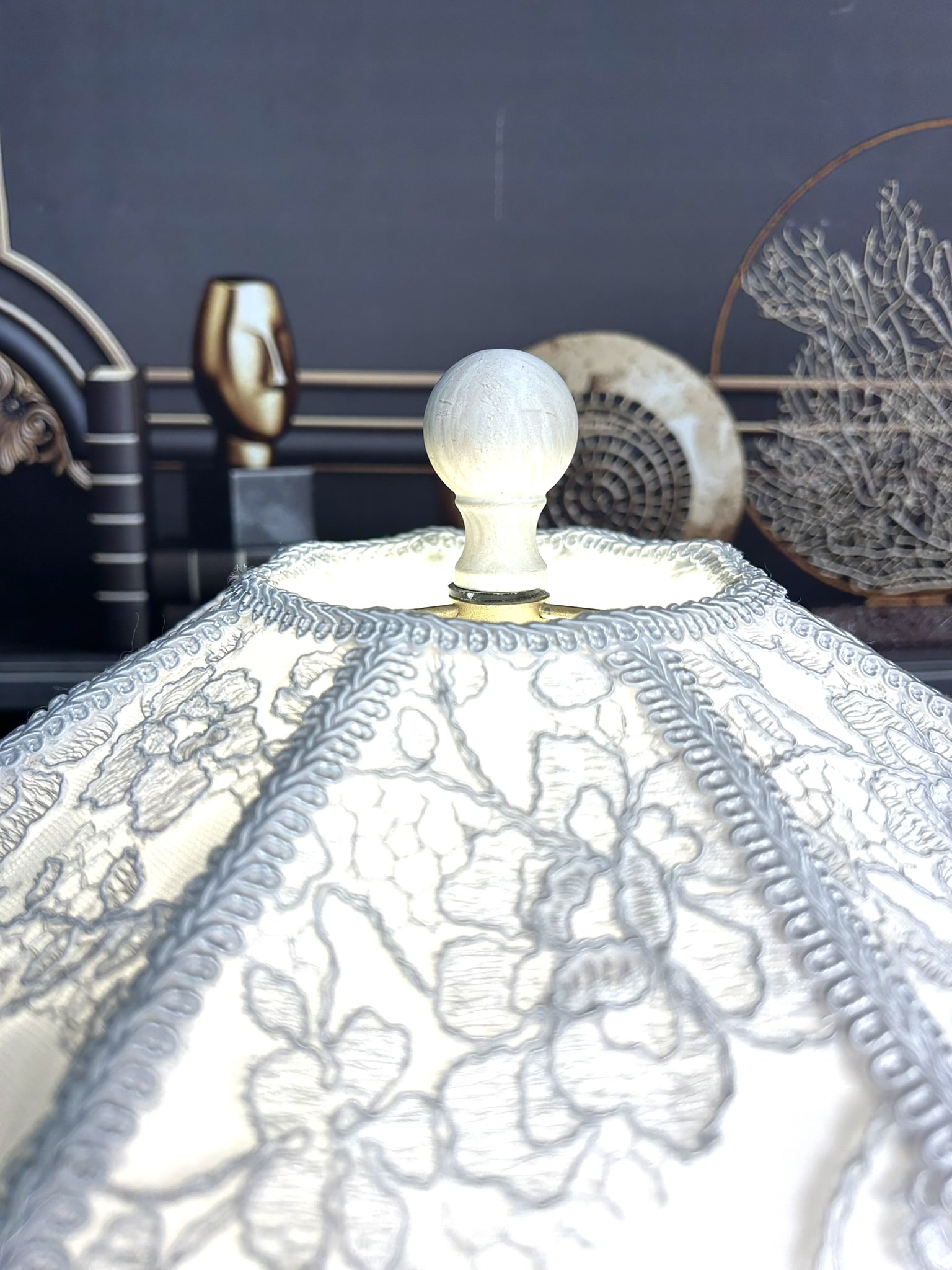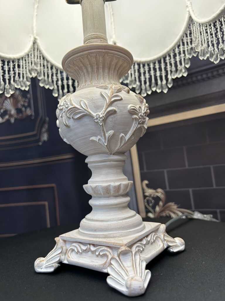 This lampshade comes with an ornate vintage-style base in a muted ivory finish. Sculpted with floral reliefs and classic curves, the base perfectly complements the delicate tones of the shade, ensuring balance and adding a refined nostalgic charm to any setting.